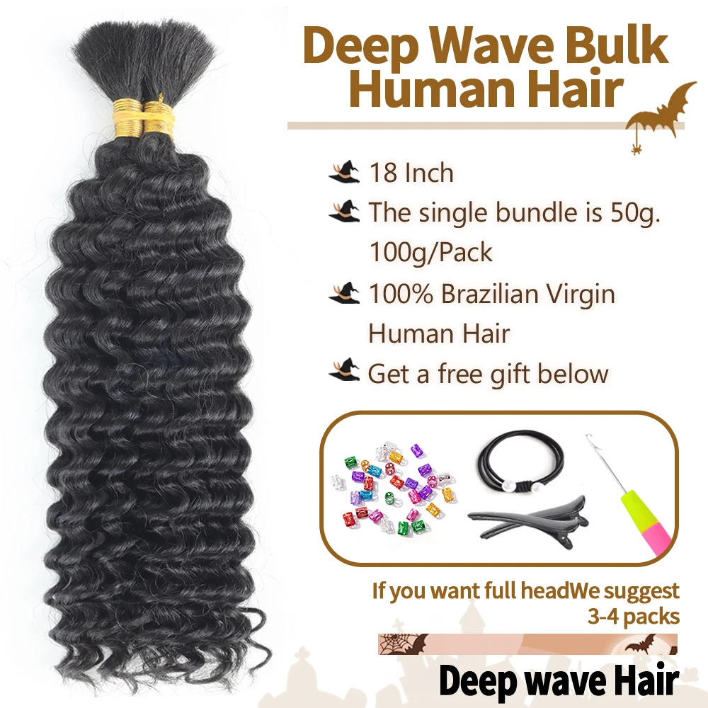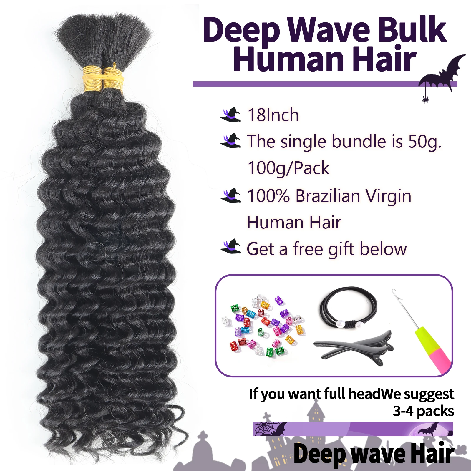 Pre Stretched Braiding Hair Boho Curls Human Braiding Hair for Boho Braids Deep Wave Bulk Hair for Knotless Braiding Bohemian